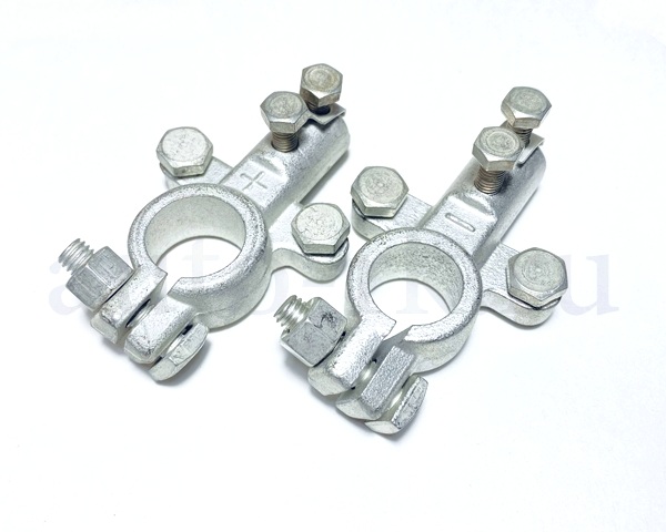 Клеммы автомобильные для аккумулятора Евро с зажимом. Клеммы АКБ изготовлены из латуни имеющей повышенную токопроводимость, что даст максимальный ток заряда и более быструю зарядку аккумулятора авто. Кроме этого латунь не подвержена коррозии, поэтому со временем клеммы не создадут проблем с напряжением в электрической цепи проводки автомобиля. Отсутствие коррозии важно для автотоваров, которые эксплуатируются в агрессивной среде: высоких и низких температурах, пары от аккумулятора, высокая влажность. Использование качественных клемм это один из факторов продлевающих срок службы аккумуляторной батареи и повышающих надежность вашей машины.