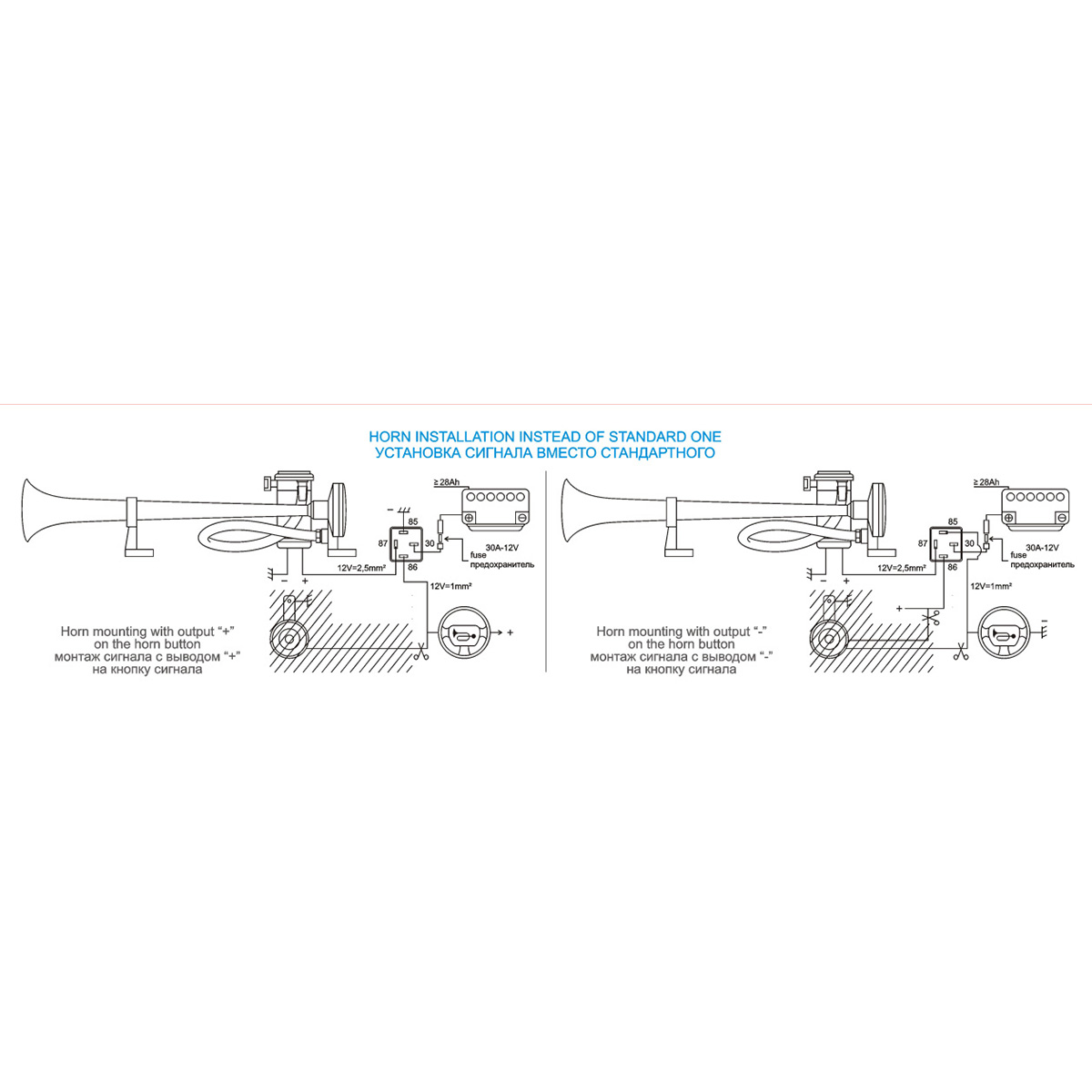Уровень звукового давления достигает 110 Дцб, обеспечивая достаточно громкий звук, тем самым повышая безопасность на дороге и во время парковки. Звуковой сигнал универсальный - подходит для любого автомобиля. Напряжение - 12В. Длина звуковых рожков 160 и 220 мм. Комплектуется компрессором и универсальным набором для крепления.